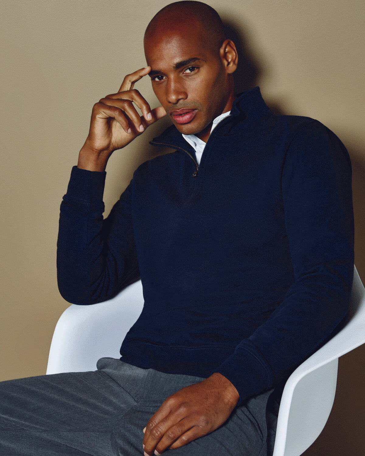 • Full needle rib double layered cuff and welt applied with twin needle stitching